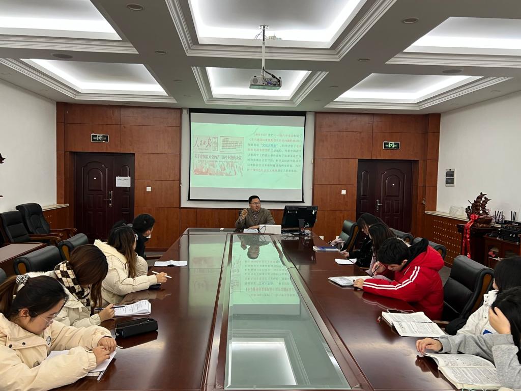 12月27日,伟德victor1946党委书记潘伟国为行政管理2020-2班全体同学宣讲党的十九届六中全会精神。