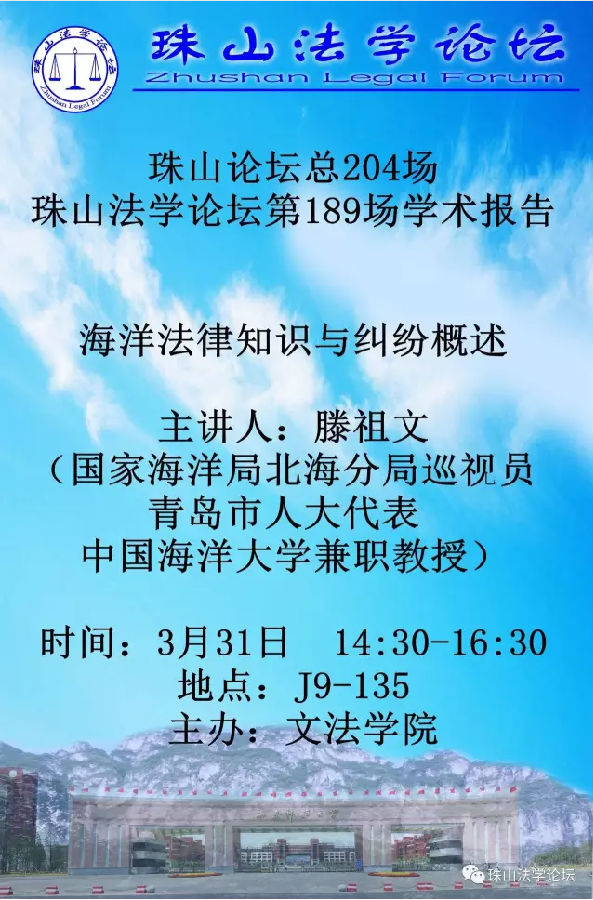 主讲人简介:滕祖文,男,著有《海洋行政管理》、《海洋行政管理专题研究》、《海区海洋行政管理研究》专著三部;合著《渤黄海区域海洋管理》、《中国海洋物权的理论与实践》等著作15部;发表论文50余篇;主笔起草国家海洋部门规章《敷设海底电缆管道管理办法》、《违反海域使用管理规定行政处分办法》两部;主持国家海洋重大课题《中国海洋战略通道研究》、《中国海监建设与管理》、《中韩海洋权益问题研究》、《新时期海上执法问题实证研究》等多项研究;从事中国海洋大学3年本科教学和12年硕博研究生教学工作;参与国际海底局先驱投资者DY95—8航次大洋考察、PL19—3油田溢油事故处理和蛟龙号首次试验性应用航次等重大国家任务。现任中国海洋法学会常务理事、中国海洋发展研究会理事、中国海洋湖昭学会理事、中国海洋学会海洋调查专业委员会常务副主任委员,青岛海洋文化研究会副会长、中国海洋研究会研究员、中国海洋大学兼职教授,青岛市人大代表。