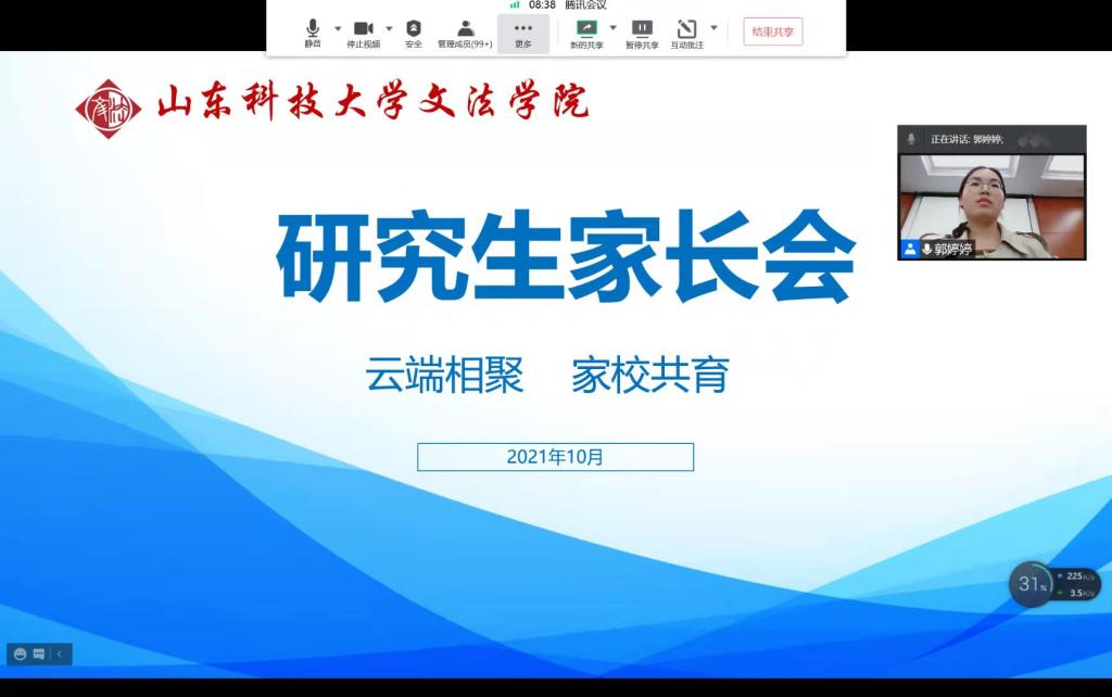 2021级辅导员王晓迪首先向家长们介绍了公司近年来在教学科研、团队建设、团队队伍、员工培养和教育等方面取得的成绩;然后向家长们汇报了员工入学以来的表现情况,介绍了公司针对2021级员工开展的新生入学系列教育、军训成效、员工文体活动等以及分析了各专业的职业生涯规划;最后聚焦新生入学适应性教育,强调了家校共育对员工健康成长的重要意义。
