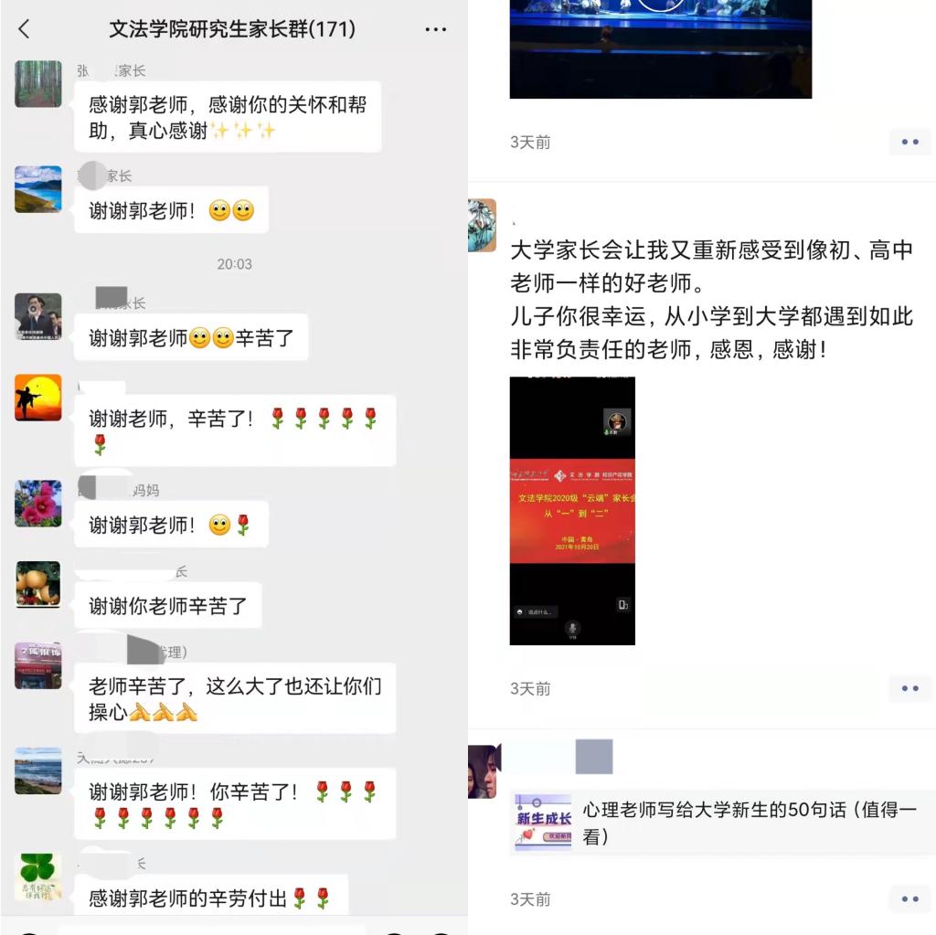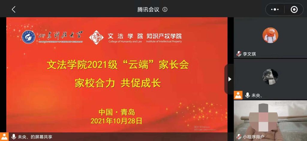 2020级辅导员韩丙华以“从‘一’到‘二’”为主题开展云端家长会。在会议中,他分别从“回首总结过去的‘一’”“把握利用现在的‘二’”“统筹谋划将来的‘三’”三个方面展开,向全体家长报告了2020级员工在大一学年的表现和收获,对学业成绩、第二课堂、专业竞赛、社会实践等内容进行了详细解读,同时与家长达成了“家校共建、共育、共督促”的育人模式。