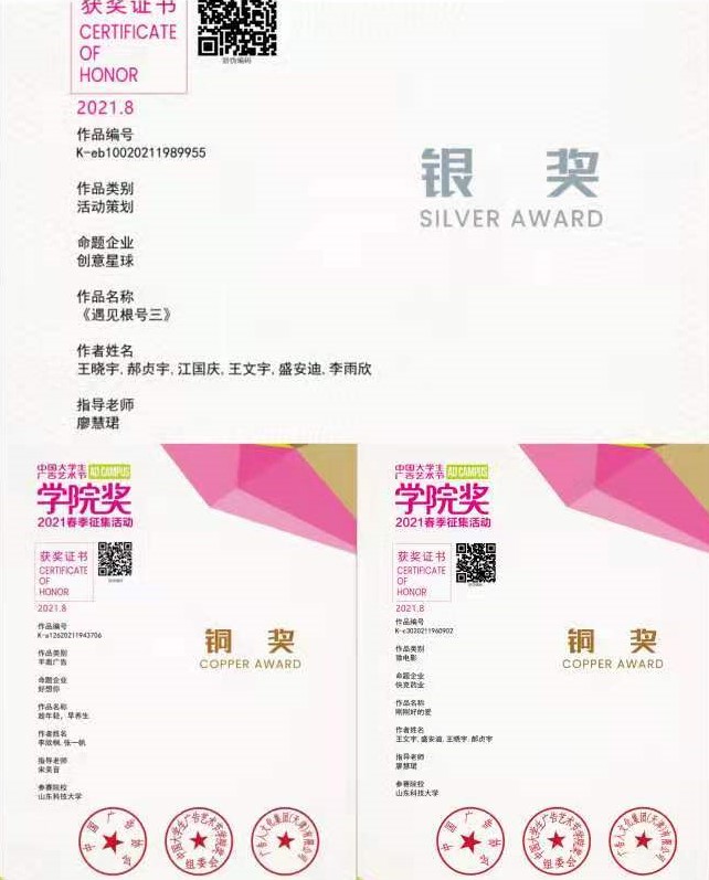 由廖慧珺老师指导,伟德victor1946广告专业及艺术公司视觉传达设计专业王晓宇、郝贞宇、江国庆、王文宇、盛安迪、李雨欣联合创作的活动策划类作品《遇见根号三》获“创意星球”命题银奖;由廖慧珺老师指导的广告专业王文宇、盛安迪、王晓宇、郝贞宇的微电影类作品《刚刚好的爱》获“快克药业”命题铜奖以及企业奖三等奖;广告学李欣桐、法学张一帆的平面广告类作品《趁年轻,早养生》获“好想你”命题铜奖;广告学郝贞宇的文案类作品《超强反应》获“榄菊”命题企业奖三等奖。