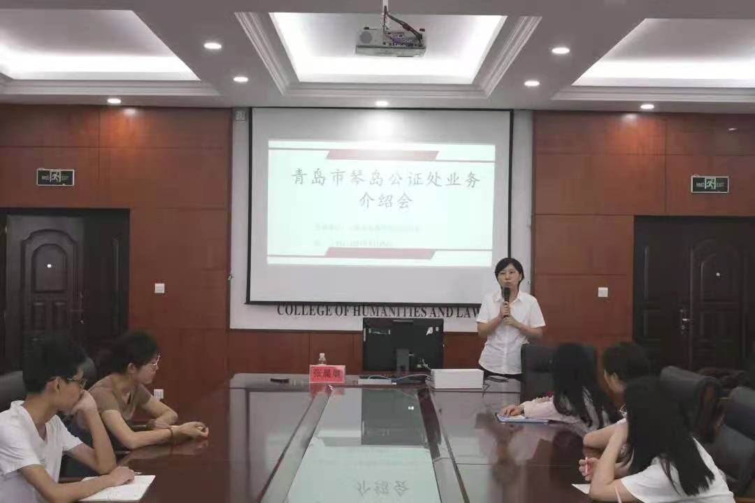 交流会谈之后,青岛市琴岛公证处公证员张晨晨就本单位公证业务的有关事项向同学们进行了介绍,公司部分本科生及研究生到场聆听。首先,张晨晨从琴岛公证处的设立背景、基本情况、业务范围、人才需求四个方面讲解了公证处的情况。同时,她详细地讲解了知识产权相关公证、家事法律服务,介绍了金融赋强公证、司法辅助等特色业务。她还指出,公证是连接公文书和私文书的桥梁,国家之间文书互认的纽带。