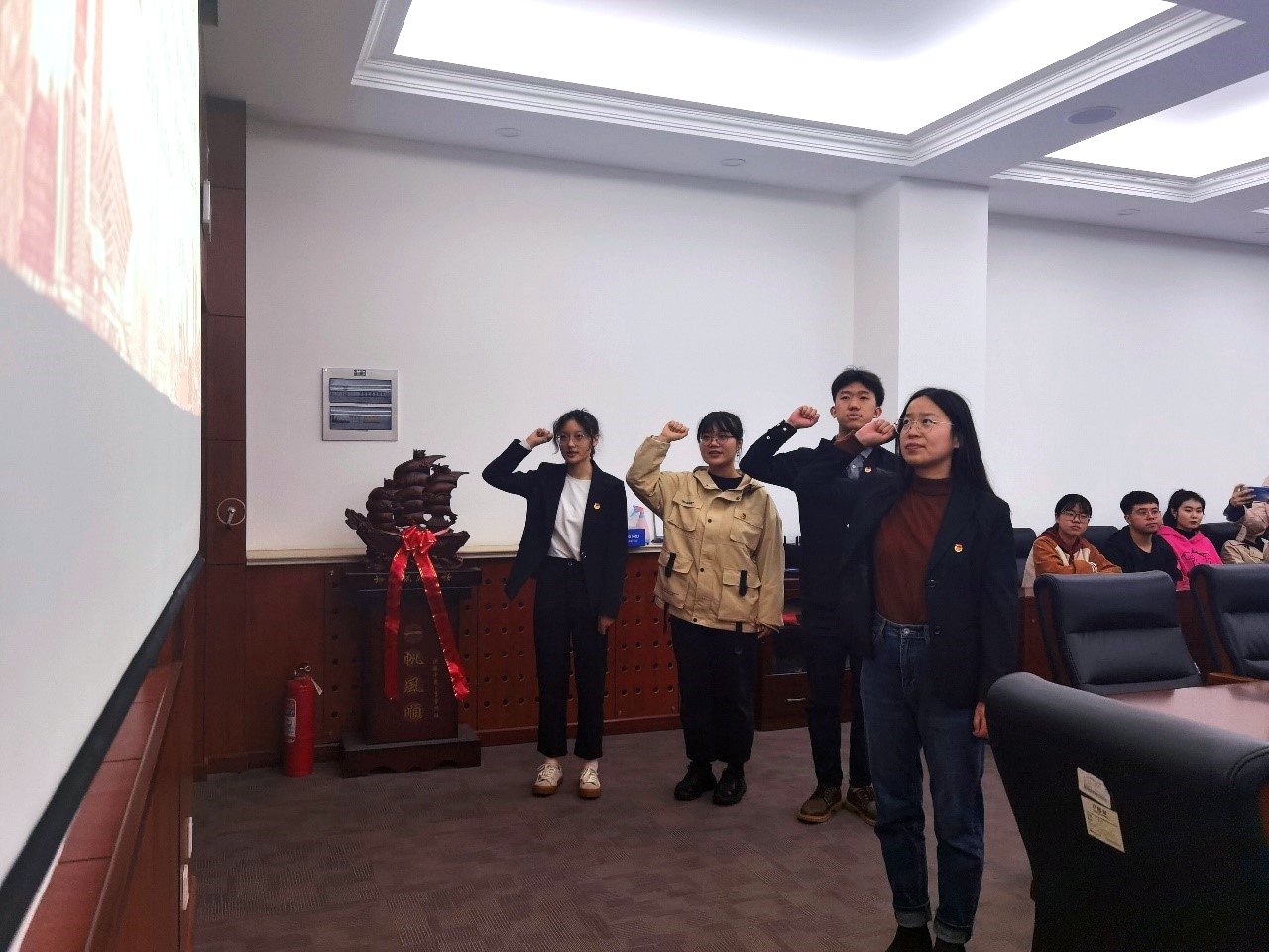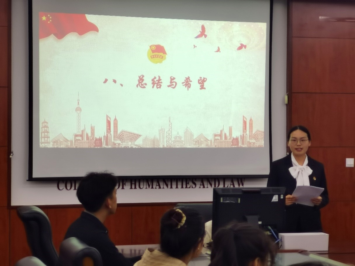 海洋法2019-1团支部王惠作为新团员代表发言,她表示能够成为一名共青团员,深感使命光荣,并号召全体新团员传承五四精神,以实际行动展示共青团员的先进性。法学2018-1赵俊博号召全体团员不忘初心跟党走,做一名理想远大、信念坚定、忠党报国、爱团敬业的优秀共青团员。