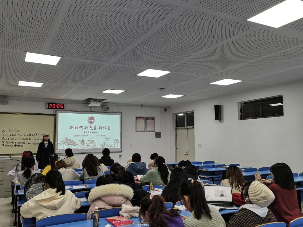此次活动由新时代新篇章、新讨论新气象、新青年新作为三个部分组成,且主要以主题学习讨论会的形式开展。在“新时代新篇章”环节中,主持人为同学们介绍了中国进入新时代后在各领域取得的突出成就及指导其发展的相关思想,并着重阐释了创新、协调、绿色、开放和共享五大发展理念的内涵。随后,进入“新讨论新气象”环节,在场同学们被随机划分为五个小组并进行两轮小组讨论。第一轮讨论中,五个小组的同学们分别对创新、协调、绿色、开放和共享这五个关键词进行理解、讨论,并将小组讨论内容写在事先准备好的答题纸上;第二轮讨论中,除每组组长固定位置不动外,其它同学交换位置,随机选择小组,并对所选小组所写内容进行补充、调整。讨论结束后,每组组长展示本组最终成果。最后,进入“新青年新作为”环节,同学们争相起立讲述自己的目标以及如何实现目标,现场氛围热烈,将活动了推向高潮。