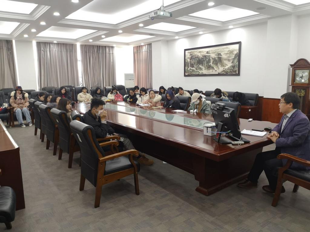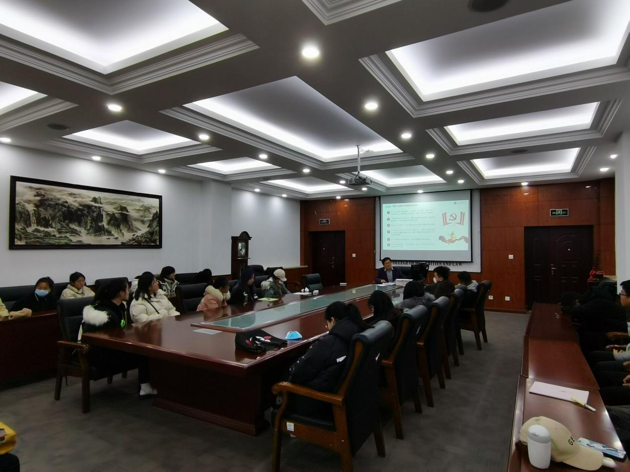 12月10日,伟德victor1946副经理秘明杰在J9-321会议室为法学2020-3班员工宣讲党的十九届五中全会精神。
