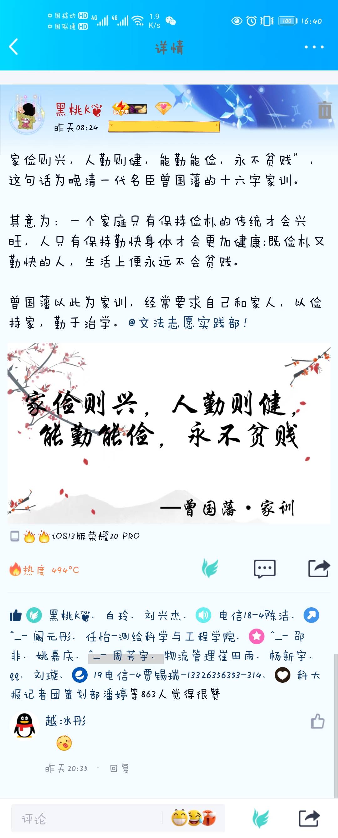 活动依托QQ和腾讯会议平台举行,参与方式采用文字及配图的方式,解说自己对家风家训的理解,同学们各具特色的解说,大大增强了此次活动的趣味性。员工会工作人员于25日晚在腾讯会议上举办家风家训小讲堂,以陆游、曾国藩等历史名人为例介绍家风家训的历史和发展历程,活动中还邀请同学们朗读梁启超的《莫问收获,但问耕耘》、张世发的《好,我一定来》等作品,让同学们在朗读中更真切的体会家风家训的重要性。