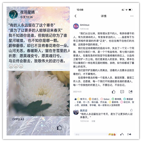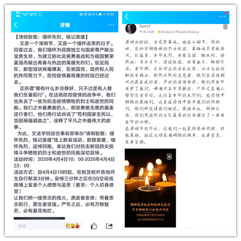 此次活动响应全国默哀三分钟的号召,引导同学们在自行默哀后通过QQ或微博平台写下自己对为抗击疫情而牺牲的英雄的追思,以文字书写情怀,以话语追思英雄,号召同学们致敬英雄、缅怀先烈。活动当天,同学们积极响应,数不尽的缅怀话语出现在各个网络平台上:“哪有什么岁月静好,只不过是有人替我们负重前行”、“他们因守护活着的人而离去,活着的人也要永远挂念着他们,才不算愧对”、“愿英魂安兮,愿英魂归兮”……字数不多,但字里行间却透漏出对英雄的真情;字数不少,但却依旧表达不尽对英雄离去的不舍。本次活动事先并未做过多的宣传工作,但在清明节当天,众多员工纷纷自发加入到活动中来,对英雄们英勇无畏、无私奉献的高尚品德致以崇高的敬意,对他们的离去表达沉痛的哀悼。