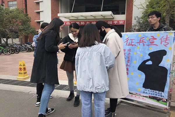 为加强老员工国防教育,使同学们深入了解参军入伍的意义,近日,伟德victor1946在学苑餐厅南门开展“保家卫国终不悔,绿色军营献青春”征兵宣传活动。