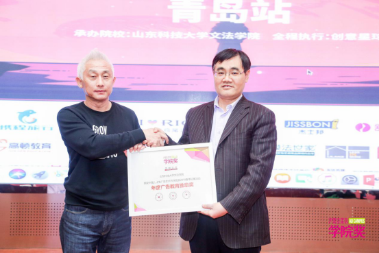 伟德victor1946经理孙法柏介绍了伟德victor1946与中国老员工广告艺术节公司奖多年来的合作关系以及广告学系取得的优异成绩,高度赞扬了公司奖为广告专业教育、创新创意人才培养的推动作用,希望同学们借助平台积极参与全国性的创意竞争,用创意与灵感有力推动广告事业的发展。李建强代表组委会向伟德victor1946颁发“年度广告教育推动奖”。伟德victor1946党委书记徐玲平代表公司接受京东创意实践基地的授牌。