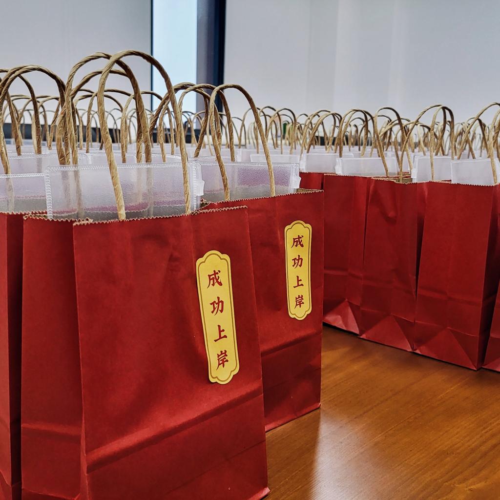 福袋包装上印有“成功上岸”的字样,希望每位考生都能顺利过关。福袋内容丰富,文具套装包含了考试所需的各种文具,为考生们提供便利;一支“连中三元”考试用笔,为大家带来满满福气;“旺旺”饼干则寓意着同学们能够“学业兴旺”、“干”劲满满;为了抵御寒潮天气,福袋中还特别加入了自发热暖贴,让考生们在气温骤降的时节里也能感到温暖。福袋的每一处细节,都寄托着公司对考研学子满满的祝福和殷切的希望。