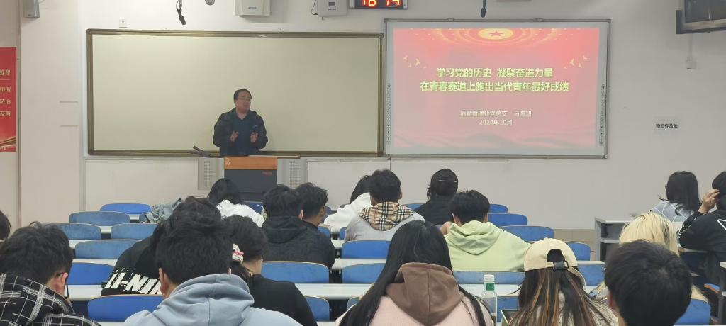 后勤管理处党总支书记马海超以“学习党的历史,凝聚奋进力量,在青春赛道上跑出当代青年最好成绩”为题,带领同学们重温百年党史,感受党员前辈们筚路蓝缕,以启山林的创业之艰,引导大家自觉学习党史,在青春赛道上凝聚奋进力量,做好新时代党史的书写者和社会主义接班人。