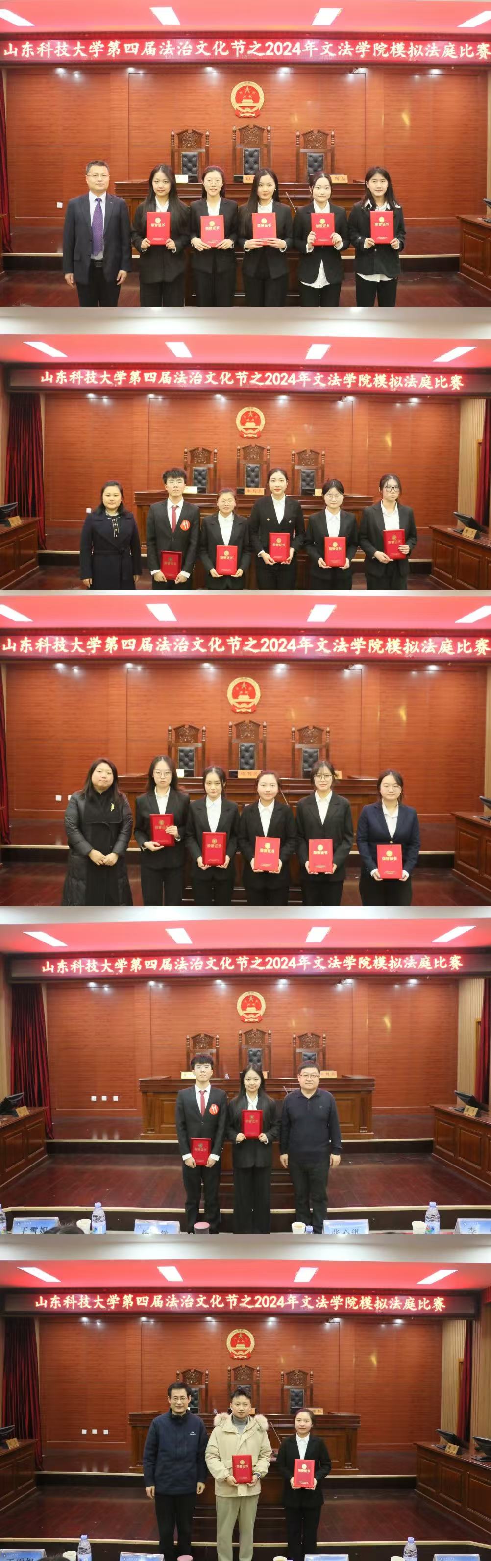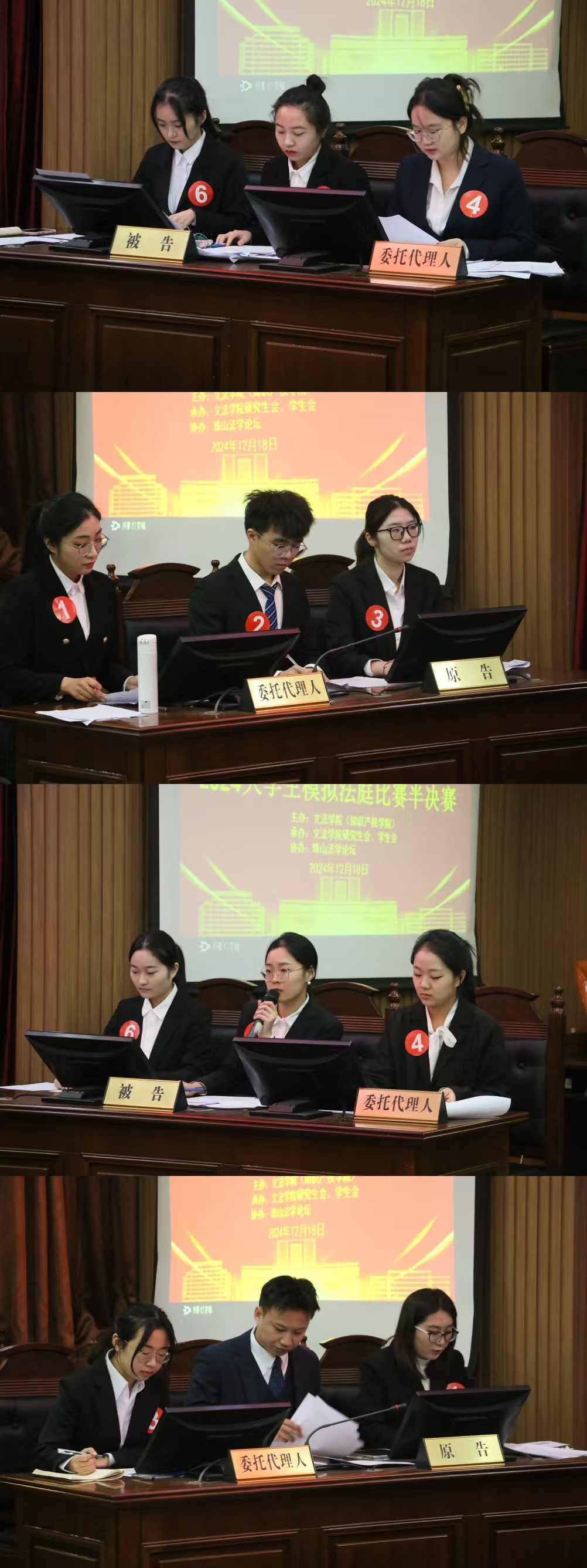本次模拟法庭比赛自11月初开始进行,分为法律文书预选赛和庭审对抗比赛两个环节。经过层层选拔,文书成绩排名前4的队伍从全部参赛的27支队伍中脱颖而出,晋级半决赛。在半决赛阶段,各参赛队伍的选手紧扣赛题,充分展现了法学素养与辩论才华。经过激烈角逐,最终“法治之光队”与“法正言直队”凭借出色的表现,成功晋级决赛。决赛现场气氛紧张而热烈,原被告双方在比赛中据理力争,从事实认定、法律适用到证据剖析,展现出了良好的团队协作精神和应变能力,每一个环节都精彩纷呈。最终,由鲁小薇、李宇晗、高新宇、徐璐、秦雯雯组成的“法治之光队”荣获冠军。亚军则由周瑛峡、张红梅、周欣彤、刘冉冉、李桂龙所在的“法正言直队”摘得。季军则由王馨卉、秦培雅、付睿、梁思逸、李娅姣组成的“大小姐说的队”获得。在个人奖项方面,鲁小薇、李桂龙获得最佳选手奖,梁思逸、周富蒙获得优秀选手奖。