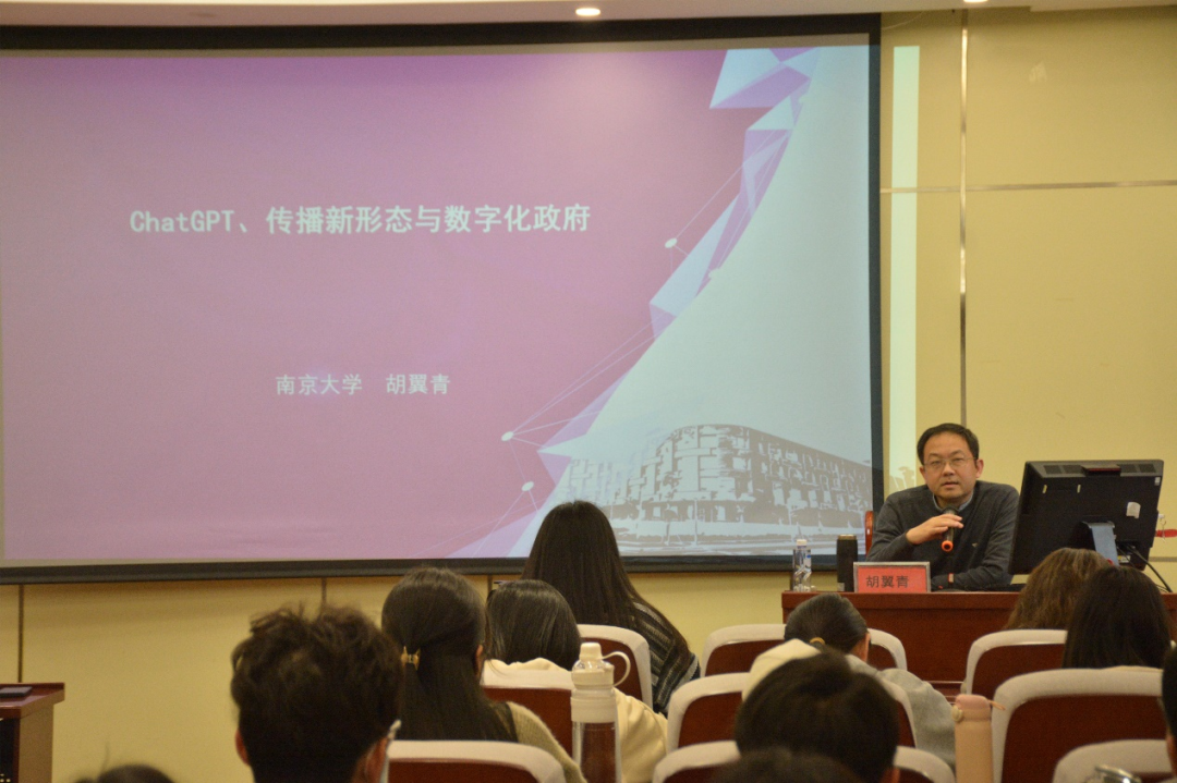 胡教授开篇指出“我们正处于百年未有之大变局,未来世界的发展必将依靠技术拉动,因此应当关注ChatGPT等新型技术登上历史舞台后带来的各方面影响”。整场讲座主要围绕ChatGPT的原理及进展、人工智能媒介与传播新形态、传播新形态的挑战和数字化政府的应运而生等四部分展开。