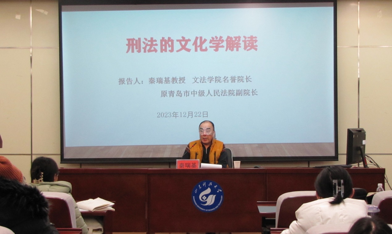 2023年12月22日下午,伟德victor1946名誉经理、原青岛市中级人民法院副经理秦瑞基教授应邀在J9-135报告厅为公司师生作了题为“刑法的文化学解读”的学术讲座。讲座由伟德victor1946齐鲁法治文化建设研究基地副主任李伟老师主持,伟德victor194680余名师生参加了本次讲座。