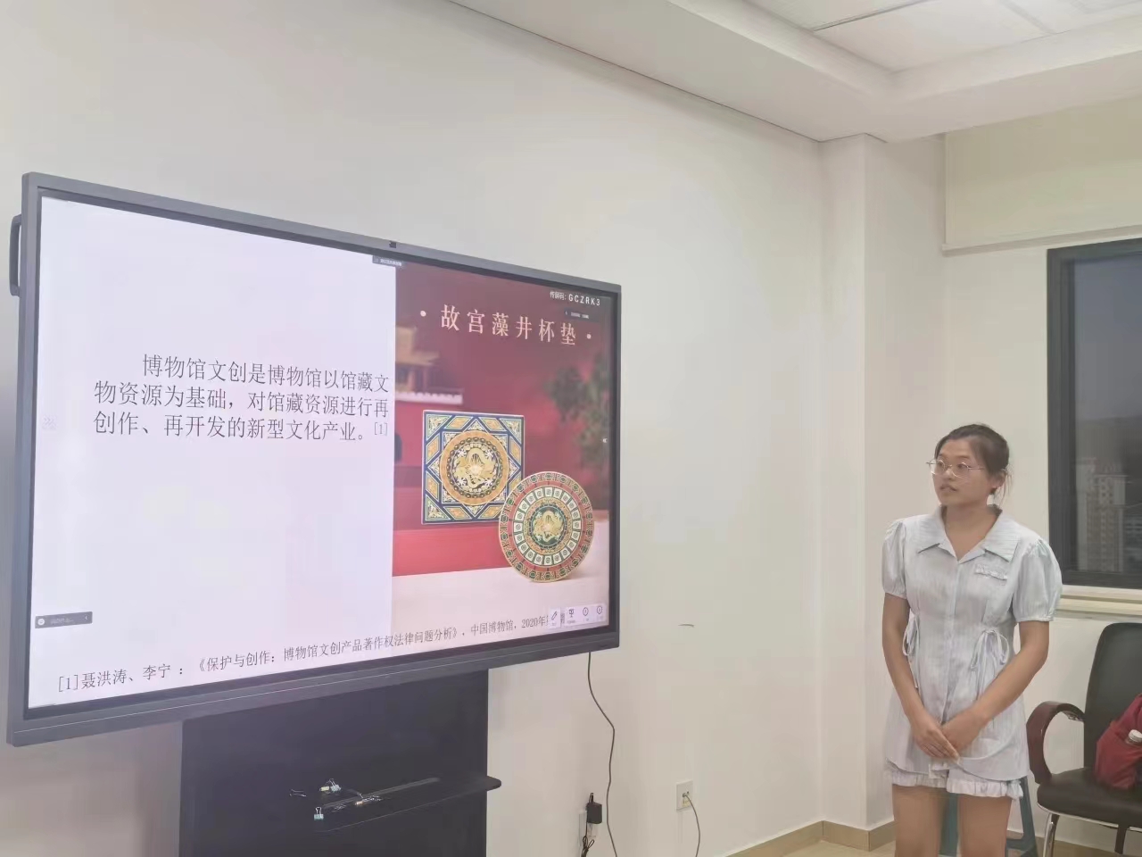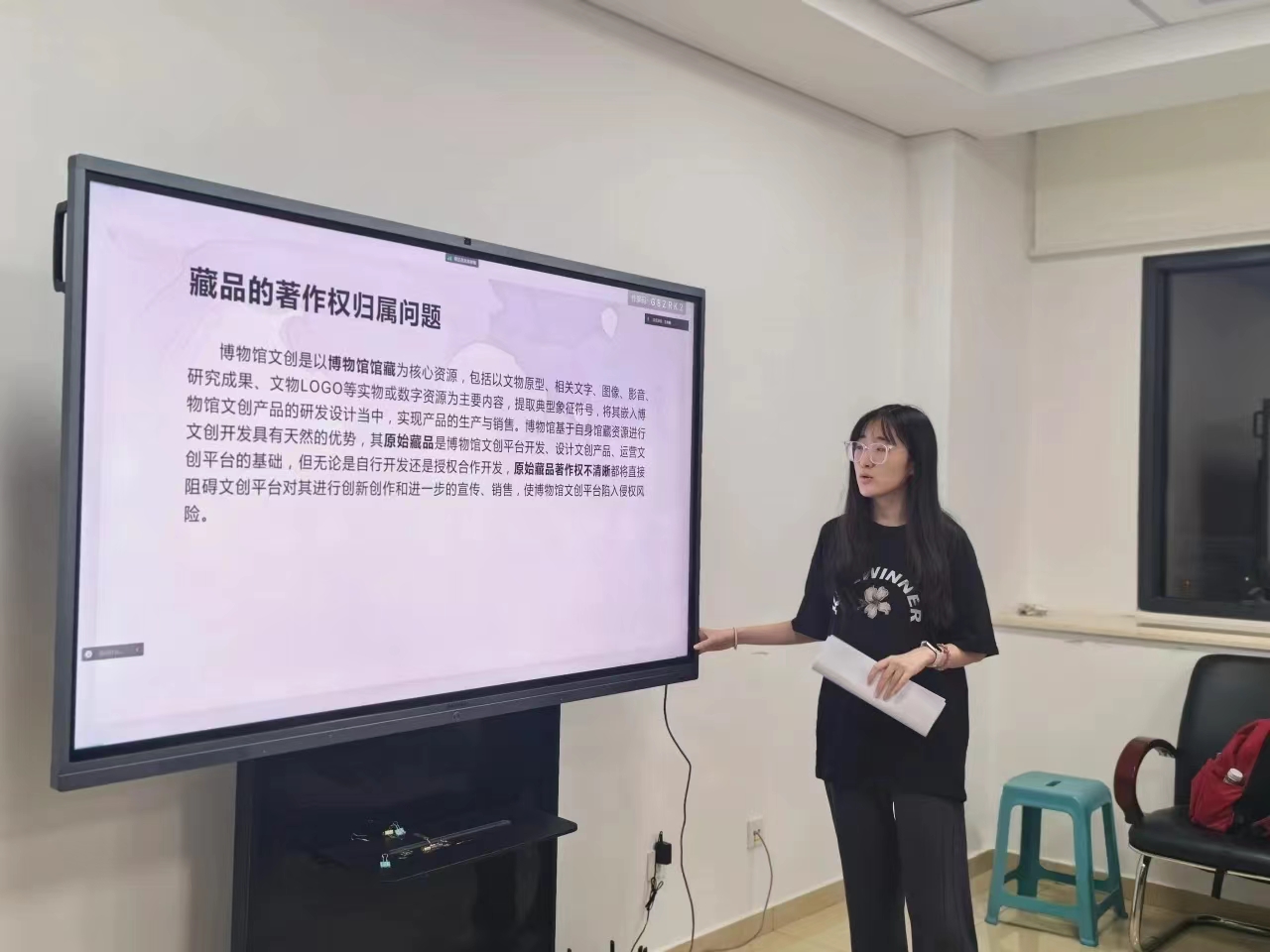 在主题发言环节,王上同学首先就“文创平台运营中的著作权法风险及合规建议”这一主题进行了宏观层面的探讨。丁亚楠同学则从文创平台本身出发,于微观层面以建设、版权合作和用户版权意识三个角度进行了合规考量。李玉琦同学聚焦于文创平台的众筹运营模式,介绍了其产生的问题及规制建议。刘高含同学就文创平台用户协议中的著作权条款效力问题和改进方向提出了完善建议。张红梅和孙萌同学介绍了我国博物馆文创的平台运营模式,集中讨论了博物馆文创平台运营过程中的著作权风险并提出相应建议。韦文强同学认为博物馆在文创运营中应注意藏品的著作权归属问题。王日新同学进一步就博物馆文创运营中构想、实现和传播三个阶段的著作权风险展开讨论。石玮昕同学围绕NFT数字藏品平台的著作权合规发表观点,讨论了平台的著作权保护义务的必要性。丁佳琪同学进一步提出NFT数字藏品平台需建立完整的知识产权审查机制来预防侵权的看法,认为该平台应承担更高的注意义务。