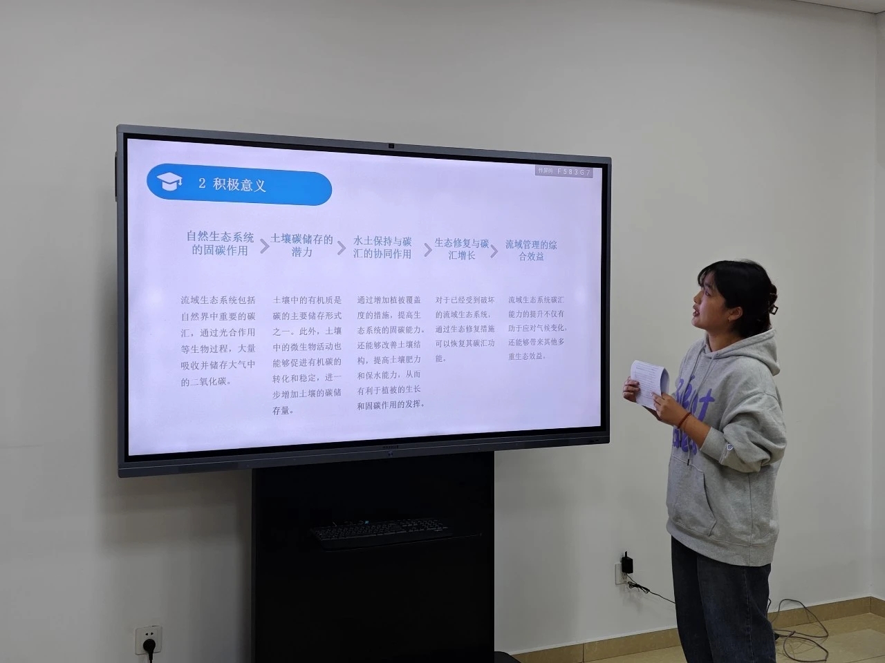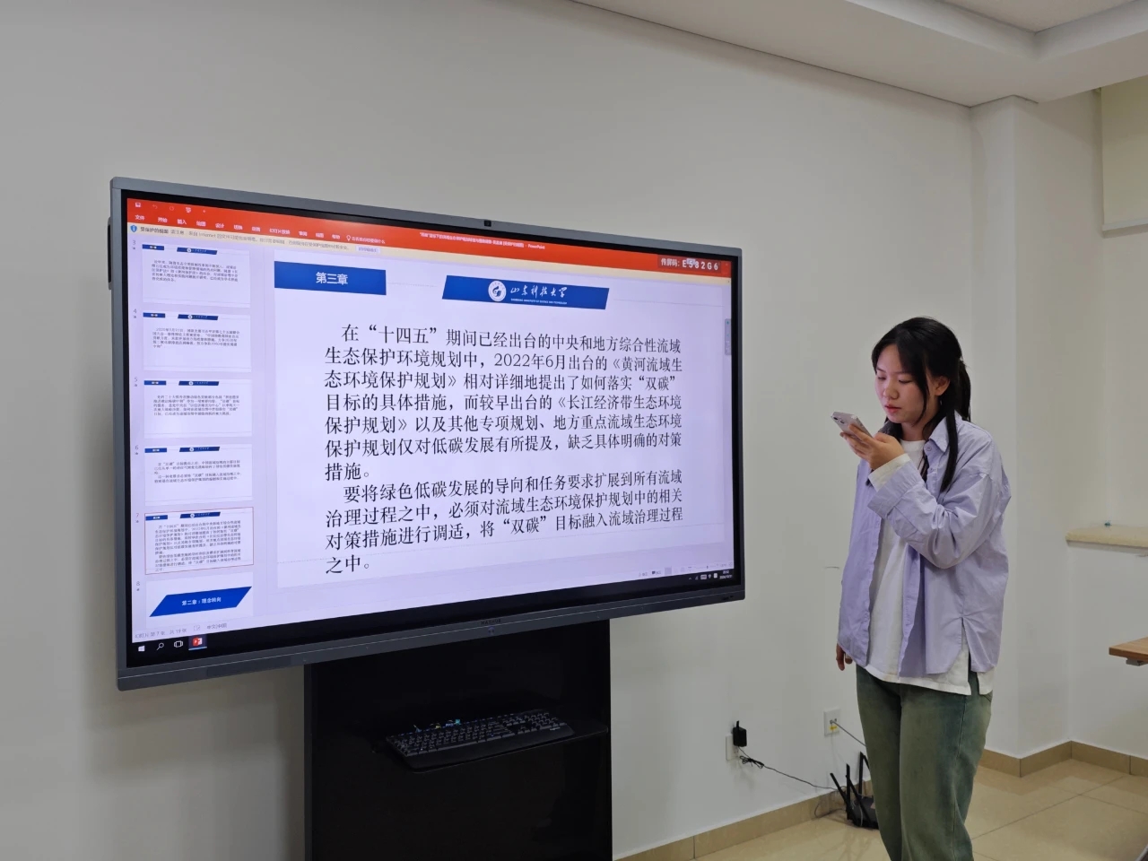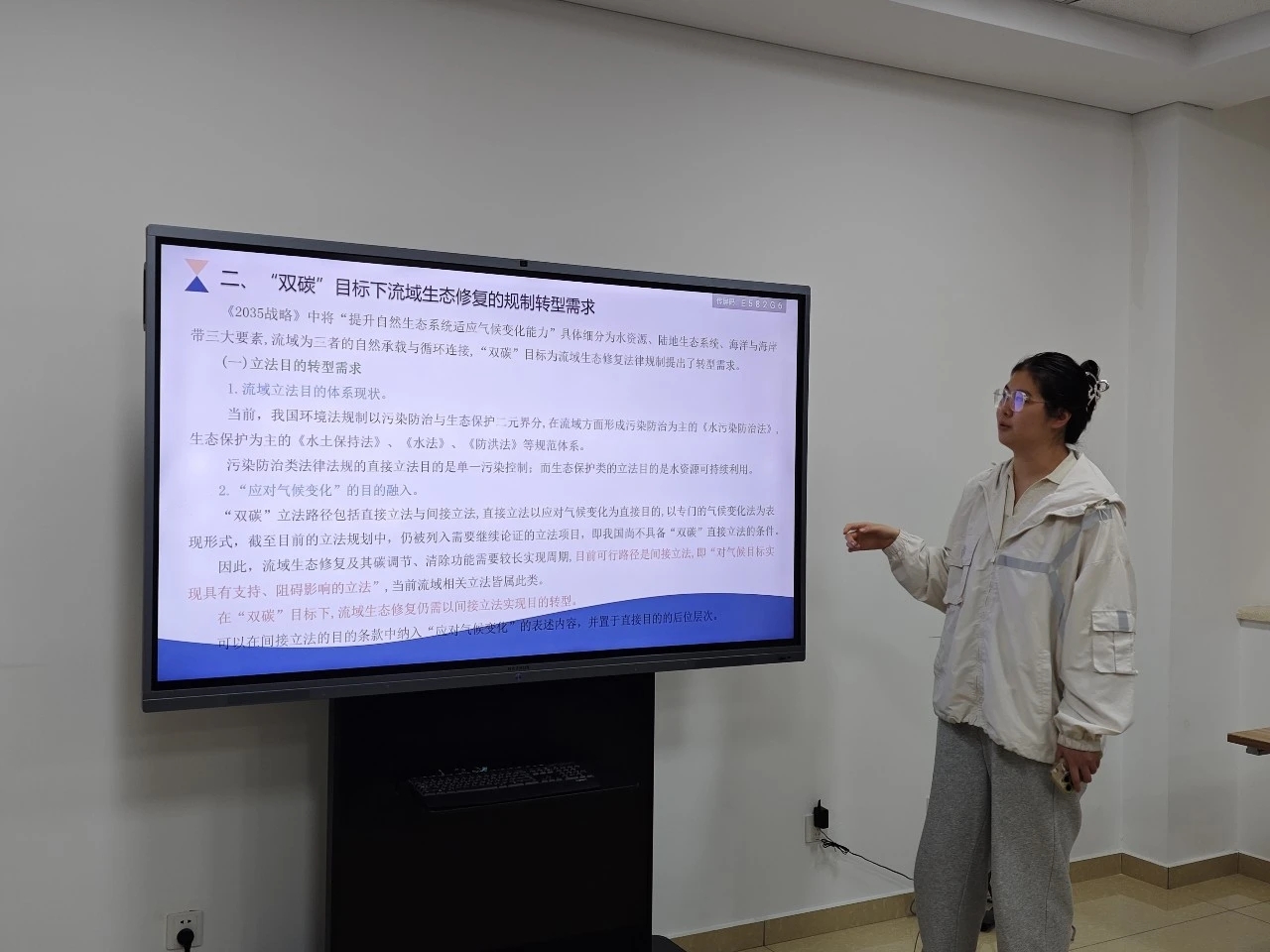 在主题发言环节,同学们结合此次沙龙主题和个人研究兴趣进行了互动交流。吴志华同学研究了“双碳”目标下长江流域综合治理法治保障;刘秋彤同学以黄河流域为例,探讨了流域能源产业低碳发展法律保障机制;吴孟澜同学讨论了“双碳”目标下的流域生态保护规划转型与措施调整;张颢译同学聚焦于“双碳”目标下流域生态修复的法律规制转型;杨顺怡同学交流了“双碳”背景下绿色金融工具在流域综合治理中的应用与法治保障;孙鑫雨同学则分析了流域综合治理中的碳汇能力提升及其法治保障。