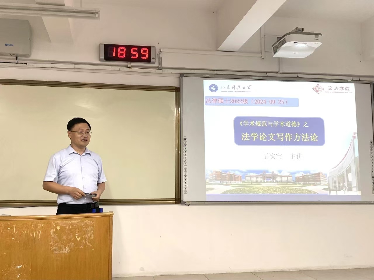 王次宝老师主讲的题目是《法学论文写作方法论》。讲座以一篇硕士论文存在的问题为引,具体从寻找题目、收集资料、展开写作、进行投稿、后期应用以及互动答疑等六个环节展开,详细阐释了法学论文写作的方法与路径。在寻找题目方面,王老师认为可以从新闻案例与社会热点,最新立法动向与司法改革文件、已发布各级基金课题的推荐选题以及法学核心期刊的最新论文选题等方面入手。在收集资料方面,王老师建议同学们积极用好公司图书馆、中国期刊网等网络资源、学术会议以及实证调研与访谈等渠道。在展开写作方面,王老师强调命题要短小精悍,提纲要逻辑严密,同时要做好材料的整理,注意写作的具体细节。在投稿环节,王老师建议同学们要了解投稿的规则与期刊的定位,尤其要注意借鉴其他同学的成功经验。在后期应用方面,王老师建议大家可以在先前研究的基础上进行拓展研究,同时可以将已有的研究成果作为申报课题的基础。最后,王老师还就法学论文写作的其他问题进行了答疑。此次讲座不仅让同学们细致了解了法学论文写作的步骤与方法,也有效提升了同学们写作专业论文的兴趣与信心。
