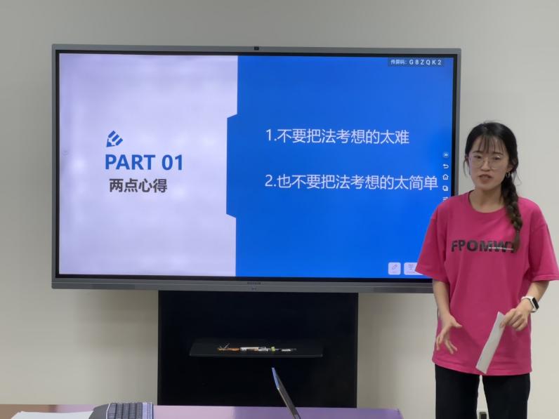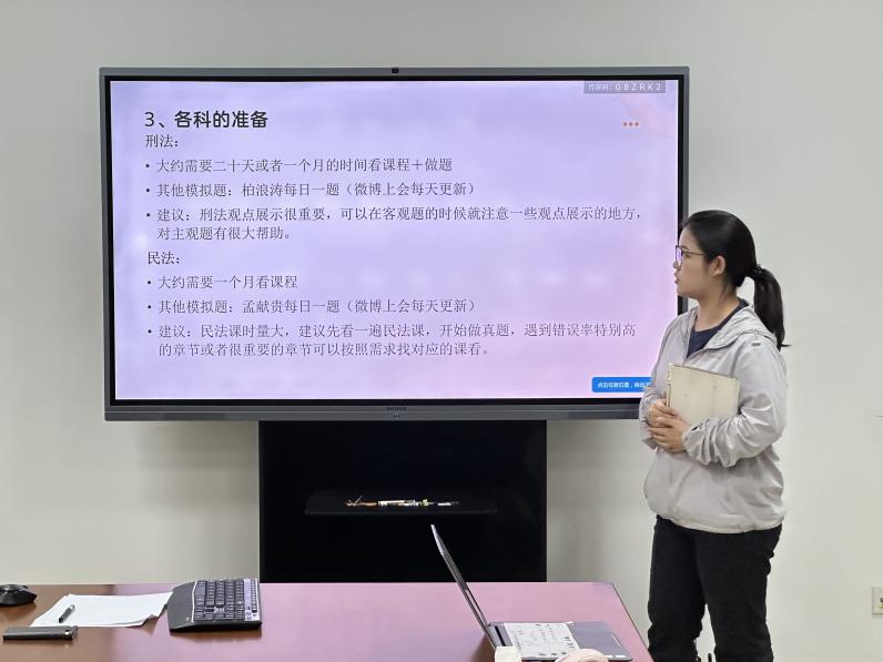 在法律职业资格考试经验分享环节,闫谨同学从法考备考的时间规划入手,建议大家分配好看书和做题的时间,把做题与背书结合起来,及时巩固;曹硕同学介绍了客观题、主观题各科分值分布情况,建议大家根据自己节奏有的放矢地进行安排,她着重分享了自己的应试技巧;梁思逸同学建议大家制定好学习计划,把握学习重点,刷题时要通过题目巩固知识点,避免盲目追求速度和数量;张晓玲同学按照不同科目有针对性地提出了看书和做题方面的建议,她提醒大家应尽早开始背诵,重视历年真题;刘春凤同学分享了自己的备考心得,建议大家放平心态、认真准备,平时利用好零碎时间记忆巩固知识点,重复背诵,强化记忆。