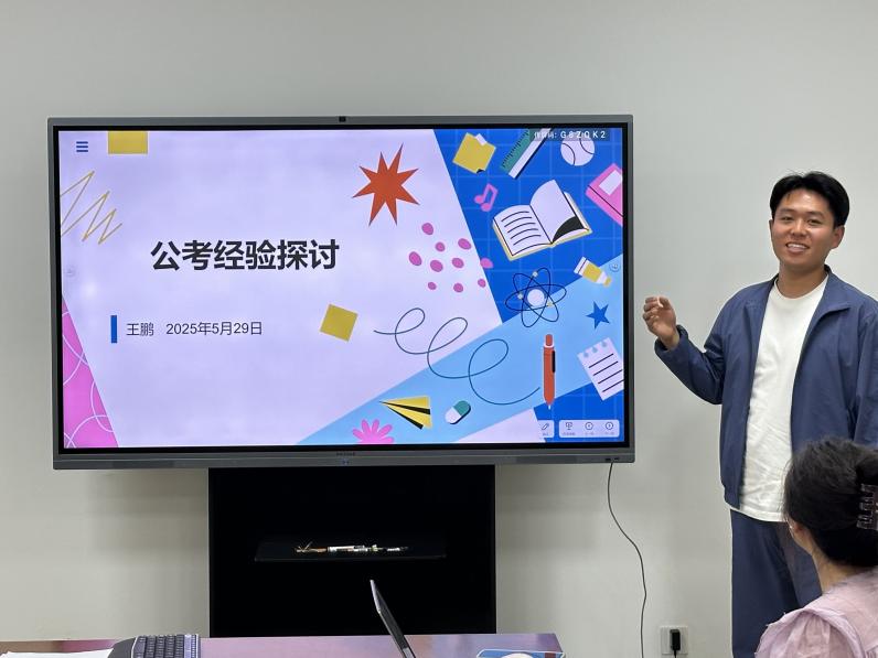 在公务员考试经验分享环节,王鹏同学建议大家尽早准备,处理好论文写作与考试准备之间的时间安排。关于岗位选择,他建议大家优先选择基层岗位,根据自己的学习情况酌情考虑高级别岗位;关于笔试备考,他介绍了各版块题目特点和练习方法,建议大家多刷真题,并根据不同题型特点有针对性地进行练习,同时多积累答题素材;关于面试准备,他分享了面试的流程和细节,建议大家控制好每道题目的作答时间,通过平时训练,形成自己的风格,避免格式化。