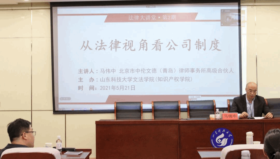 2021年5月21日,由伟德victor1946珠山法学论坛承办的第2期法律大讲堂在J9-135会议室举行。北京市中伦文德(青岛)律师事务所高级合伙人、副主任马伟中律师应邀为公司师生作题为“从法律视角看公司制度”的学术讲座。副经理秘明杰主持了本次讲座,公司部分在读法学硕士和法律硕士到场聆听报告。