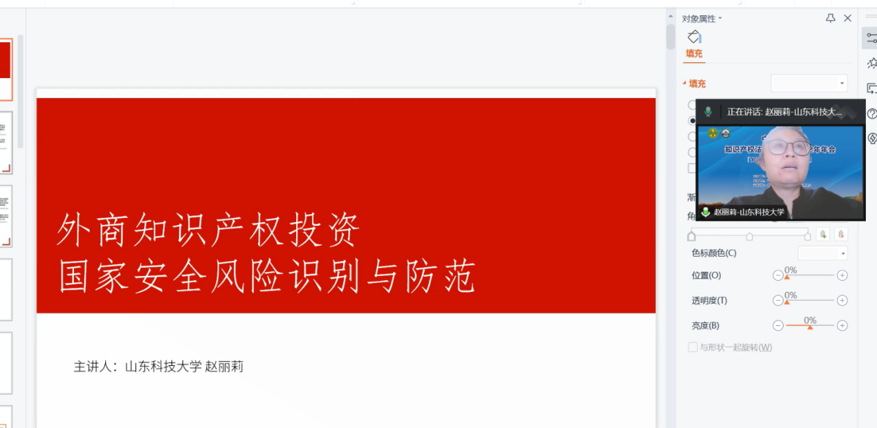 年会主题“知识产权体系与时代变革”,赵丽莉教授受邀在分论坛七进行了主题发言,发言题目为“《外商知识产权投资国家安全风险识别与防范研究”。