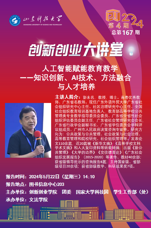 创新创业大讲堂(总第167期):人工智能赋能公司产品 一一知识创新、A1技术、方法融合 与人才培养