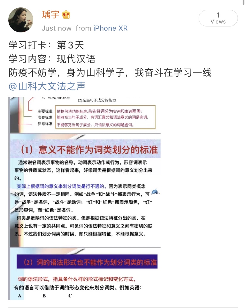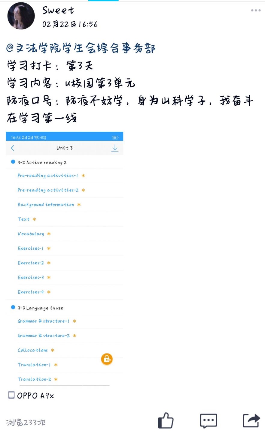 本次活动以“防疫不妨学,身为山科学子,我奋斗在学习一线”为口号,依托QQ空间、新浪微博等媒体平台,分享同学们对于专业知识、社会技能等内容的自主学习情况,并进行线上打卡签到,旨在引导同学们树立自律意识,利用好延迟开学期间的时间,激发同学们的学习动力,增进同学之间的学习交流,提高同学们在学习中的获得感。