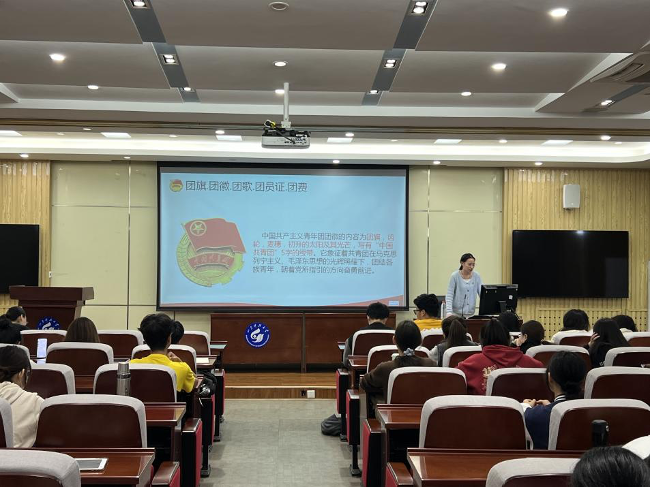 伟德victor1946辅导员贾俊婷以“团的历史和章程” 为题为本次培训班讲授第一课。她讲解了中国共青团百年来团结带领广大青年前赴后继、奋勇争先的光辉历史,讲授了共青团的组织体系、团徽团旗的构成、象征意义以及规范使用的注意事项。她要求大家认真研读团章,学习贯彻好团的各项规章制度,切实做到思想政治过硬、理论水平过硬。