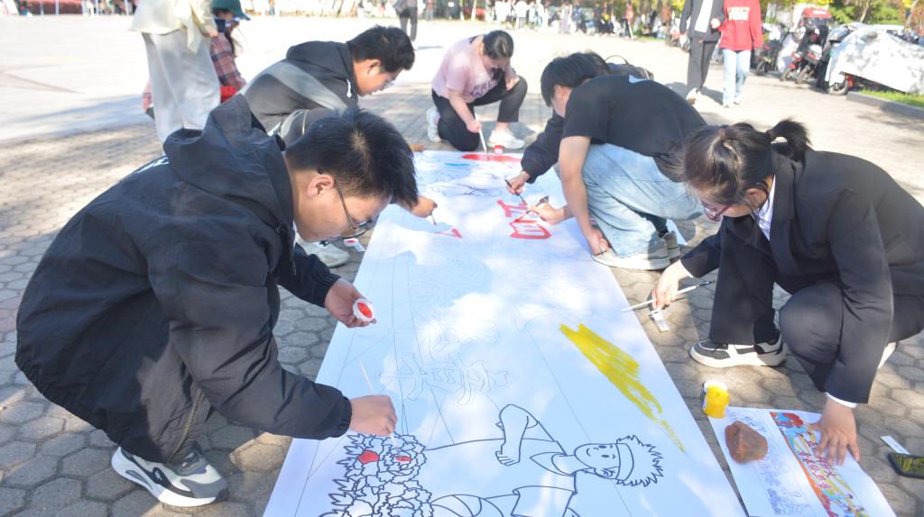 活动现场,参加活动的同学们手执画笔,调颜料、描画边、涂点缀,大家齐聚一堂,共绘长卷华章。笔墨酣畅淋漓,画卷气势磅礴。同学们以笔作媒,以画寄情,拓印风雨历程,勾勒宏伟蓝图,一道道色彩,一张张笑脸,描绘了百年来的峥嵘岁月,注入了新时代青年源源不断的青春活力,用画笔书写着对国家和民族复兴的美好夙愿。