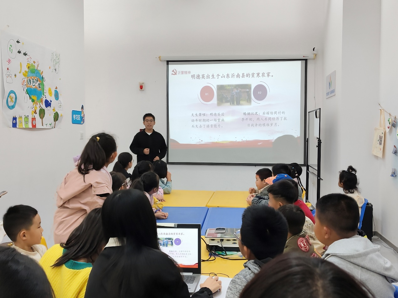 活动伊始,宣讲志愿者们从沂蒙山区的革命故事讲起,激发了小朋友们对革命英雄和革命烈士的崇敬之情。宣讲员们通过多媒体资料展示着“沂蒙六姐妹”等一个个鱼水军民情的生动事迹,引得现场听众无不深受感动,并且唤起了对英雄们的热烈情感。随后,宣讲员娓娓道来,向大家介绍了新时代以来国家为做好英雄烈士的保护和宣传工作所做的努力,为大家宣讲了《中华人民共和国英雄烈士保护法》的部分内容,号召大家主动学法守法,自觉崇尚、学习、捍卫英雄烈士和他们高尚的精神,并且同社会上的亵渎英烈、破坏英雄纪念设施的行为作斗争。