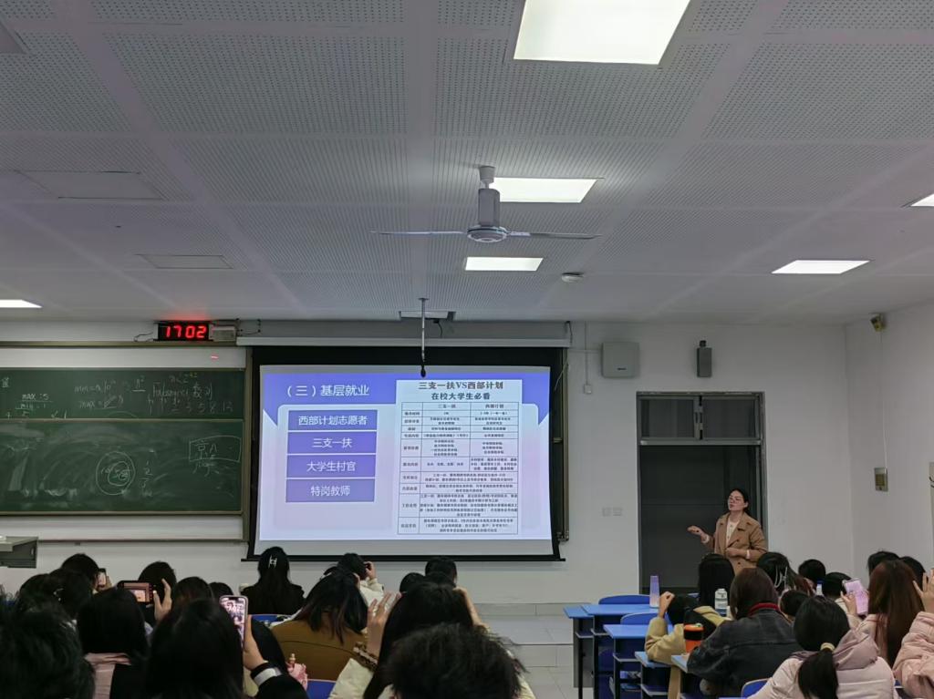 郭婷婷强调了基层工作对青年成长的重要意义,鼓励同学们要勇于担当、敢于实践,将个人的梦想融入到国家和民族的事业中去。随后,她分享了近年来公司在基层就业工作中取得的成绩以及优秀员工在基层工作中的成长经历和感悟,员工们扎根基层无私奉献的故事让同学们深刻感受到了基层工作的魅力和价值,也激发了他们投身基层、服务社会的热情和决心。最后,她为同学们详细讲解了西部计划、三支一扶等基层就业项目的政策、就业准备、规划路径等。