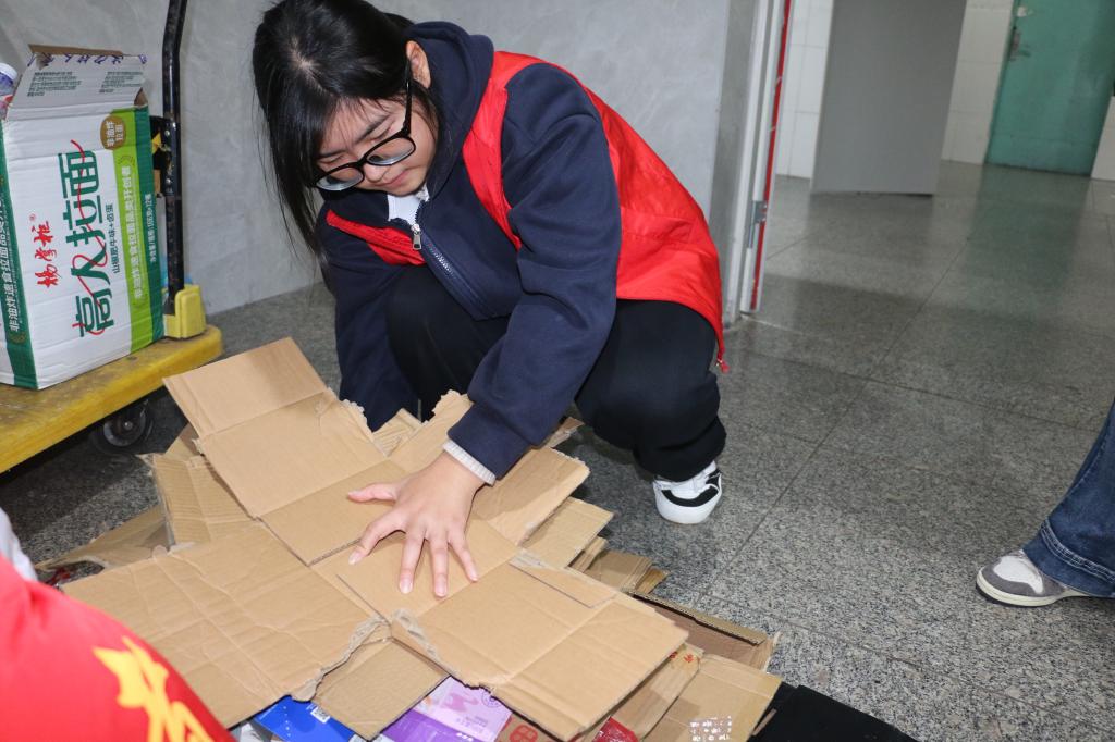 活动现场,志愿者们身着红色马甲,化身“环保使者”,大家各司其职,分工明确。负责收集的人员穿梭于各宿舍,以礼貌询问的方式邀请同学们参与回收;整理组人员则坚守在宿舍楼下的回收点位,将大家收集的废品进行分类、捆扎、装袋。活动现场秩序井然,同学们积极响应,以实际行动支持环保与公益。(通讯员:马程程、郭云、林晓甜;编辑:王晓迪;审核:李冬)